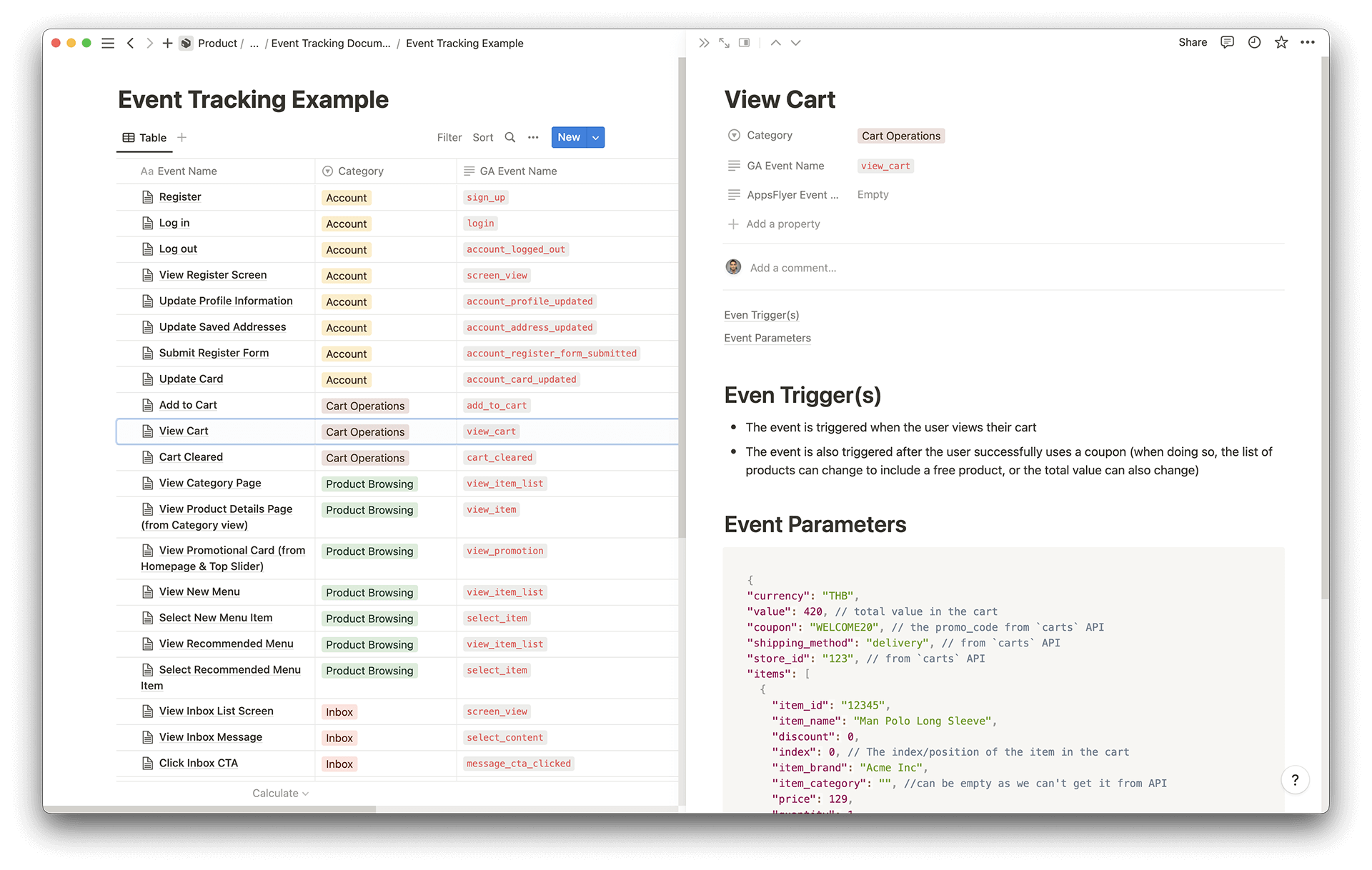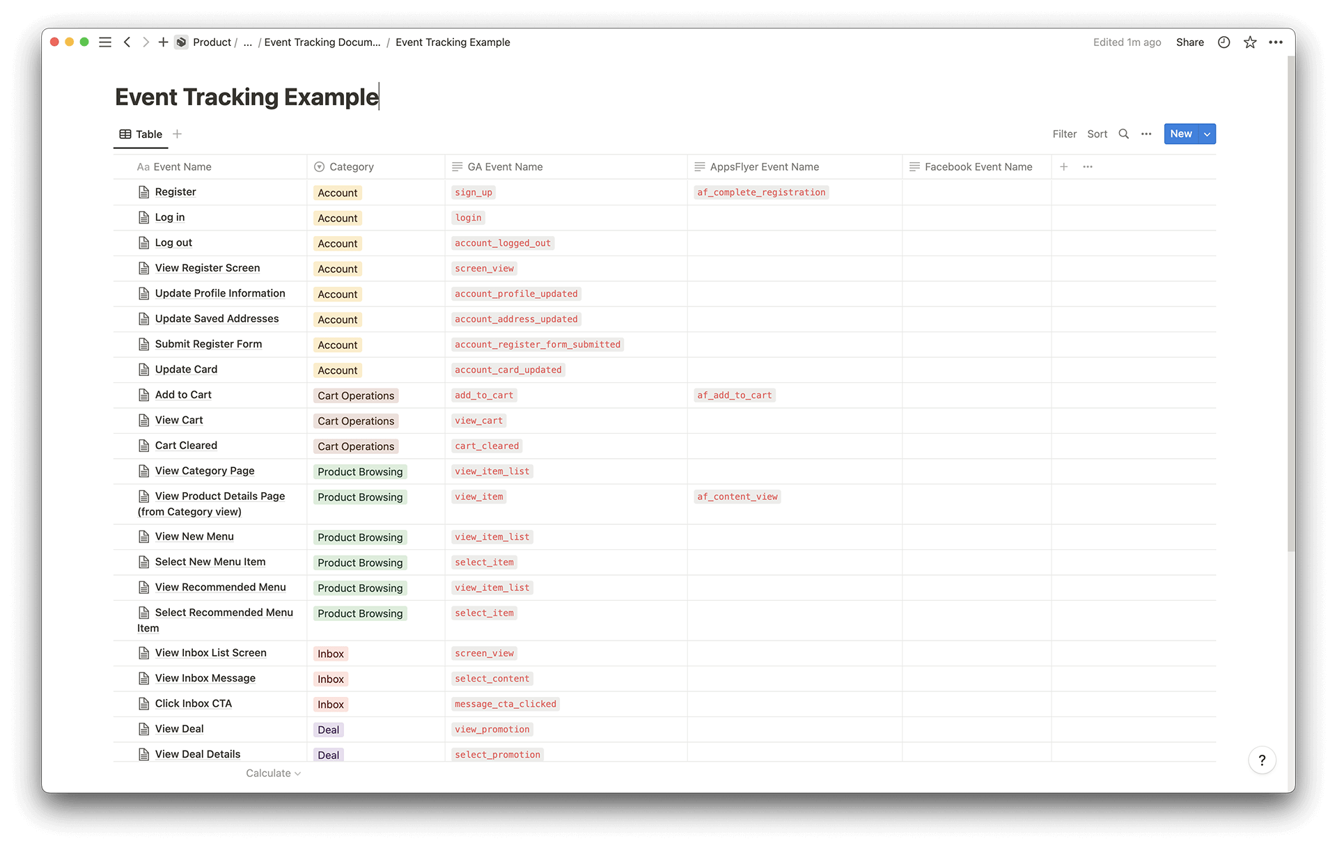 This event tracking documentation shows the mapping of events for the different destinations (Google Analytics, AppsFlyer, Facebook) and all the parameters.